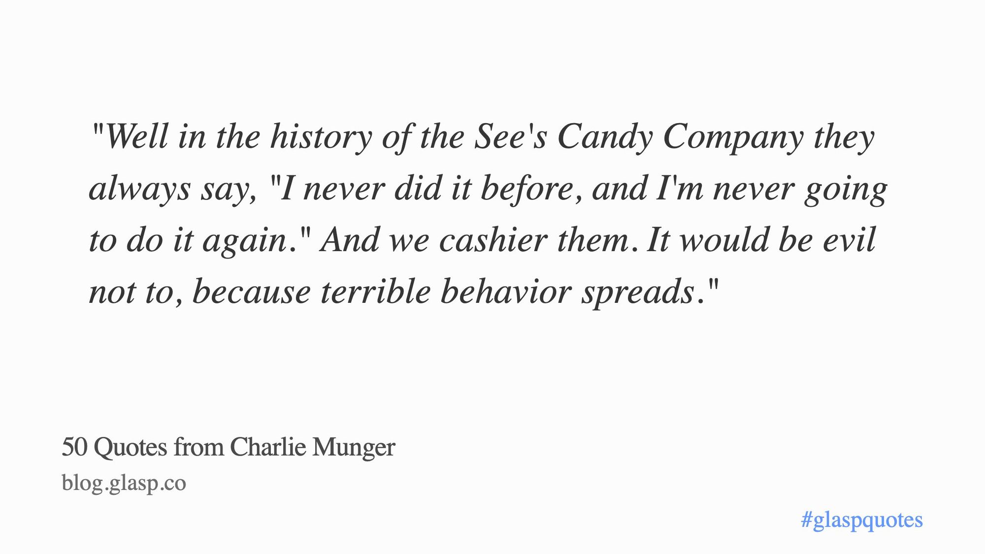 15. "Well in the history of the See's Candy Company they always say, "I never did it before, and I'm never going to do it again." And we cashier them. It would be evil not to, because terrible behavior spreads."