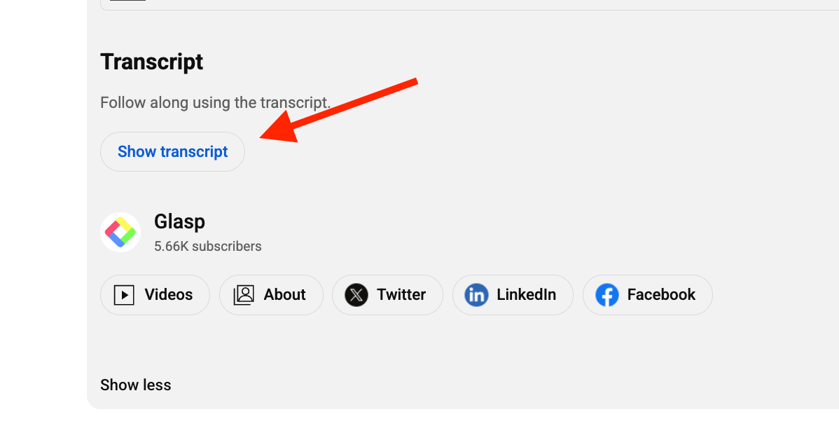 - In the meantime, you can still access transcripts by clicking "Show Transcript" in the YouTube video description. This will display the full transcript with timestamps, which you can read and copy manually.