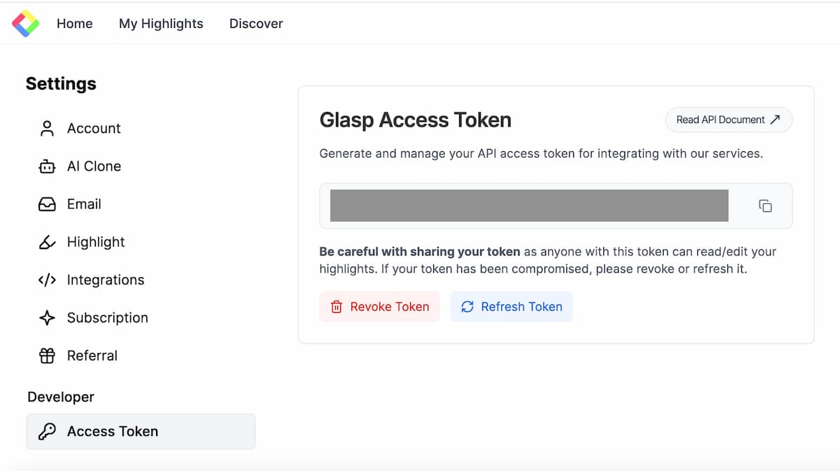 In Glasp, navigate to your Account Settings > Access Token and copy your access token.