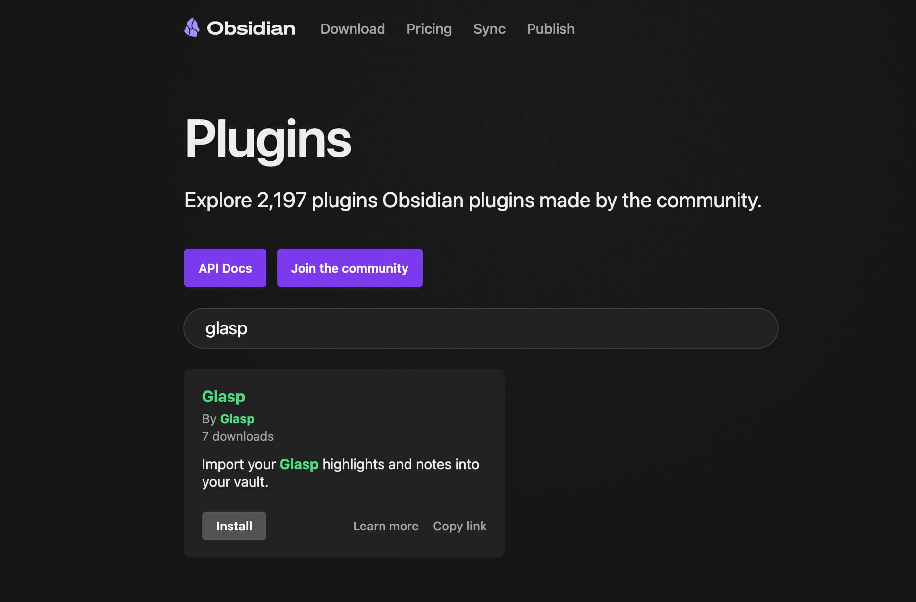 - Download the Glasp Obsidian Plugin directly from the plugin page.