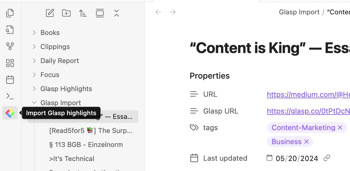 Click "Import Glasp Highlights" in the Obsidian sidebar. Your highlights will be fetched and added to your Obsidian vault.