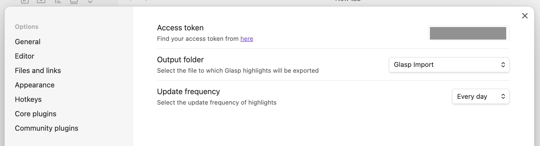 Open the plugin settings in Obsidian and paste your Glasp access token.