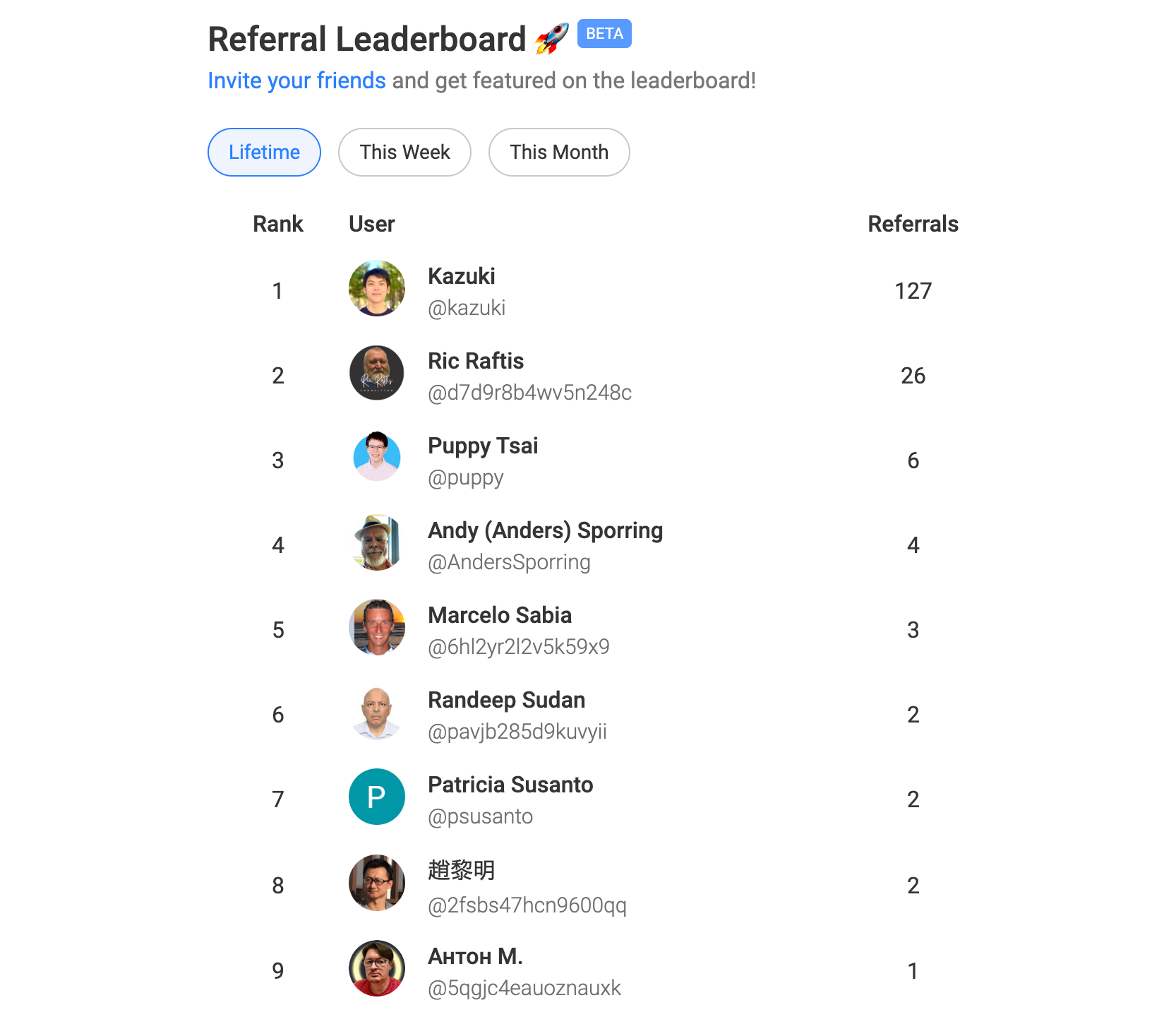 We started calculating the number of users signed up through your invitation on June 13, 2023. So, even if users signed up newly through your invitation before that date, it's not counted. However, if a new user signed up through your invitation link on a top bar or setting, it's counted.