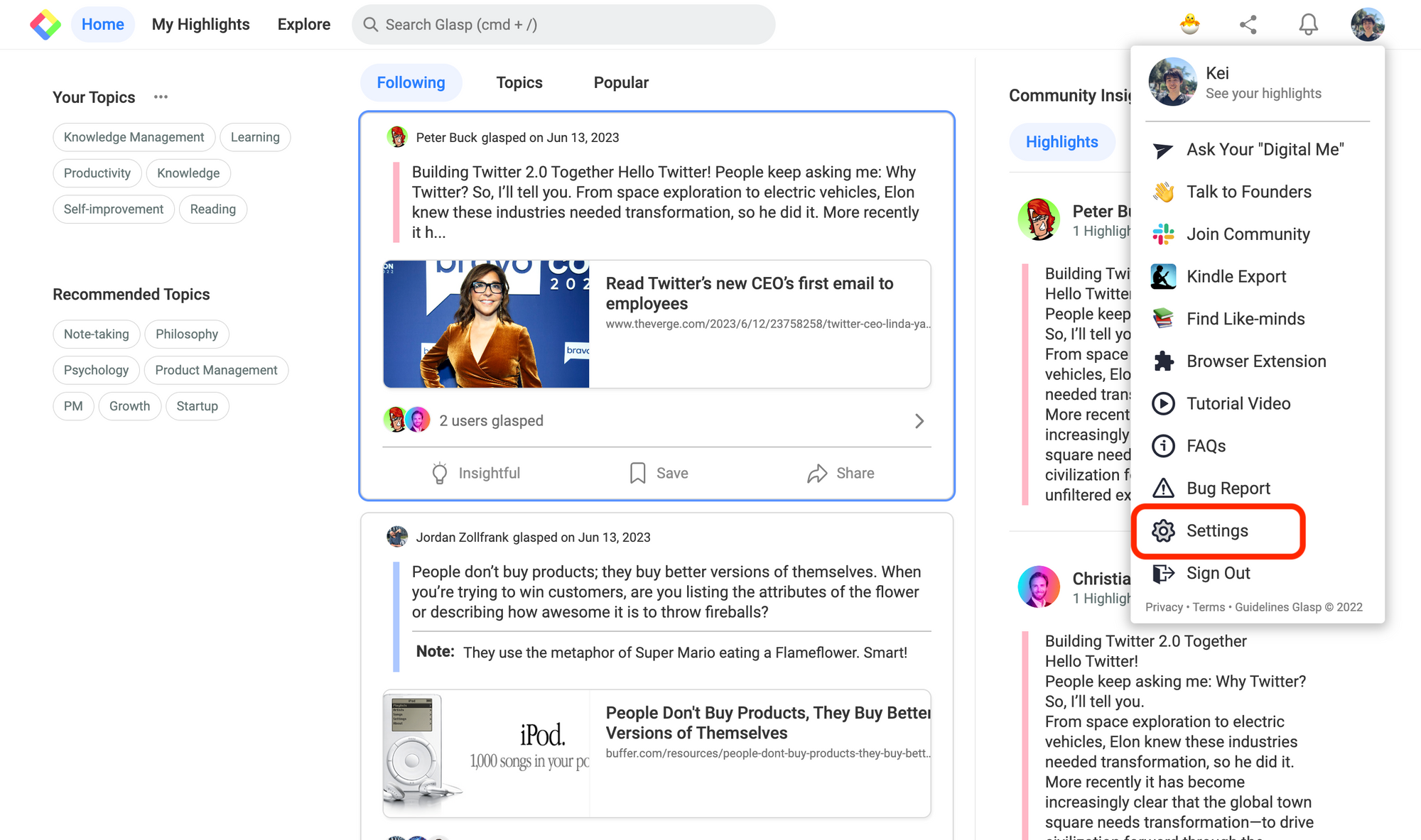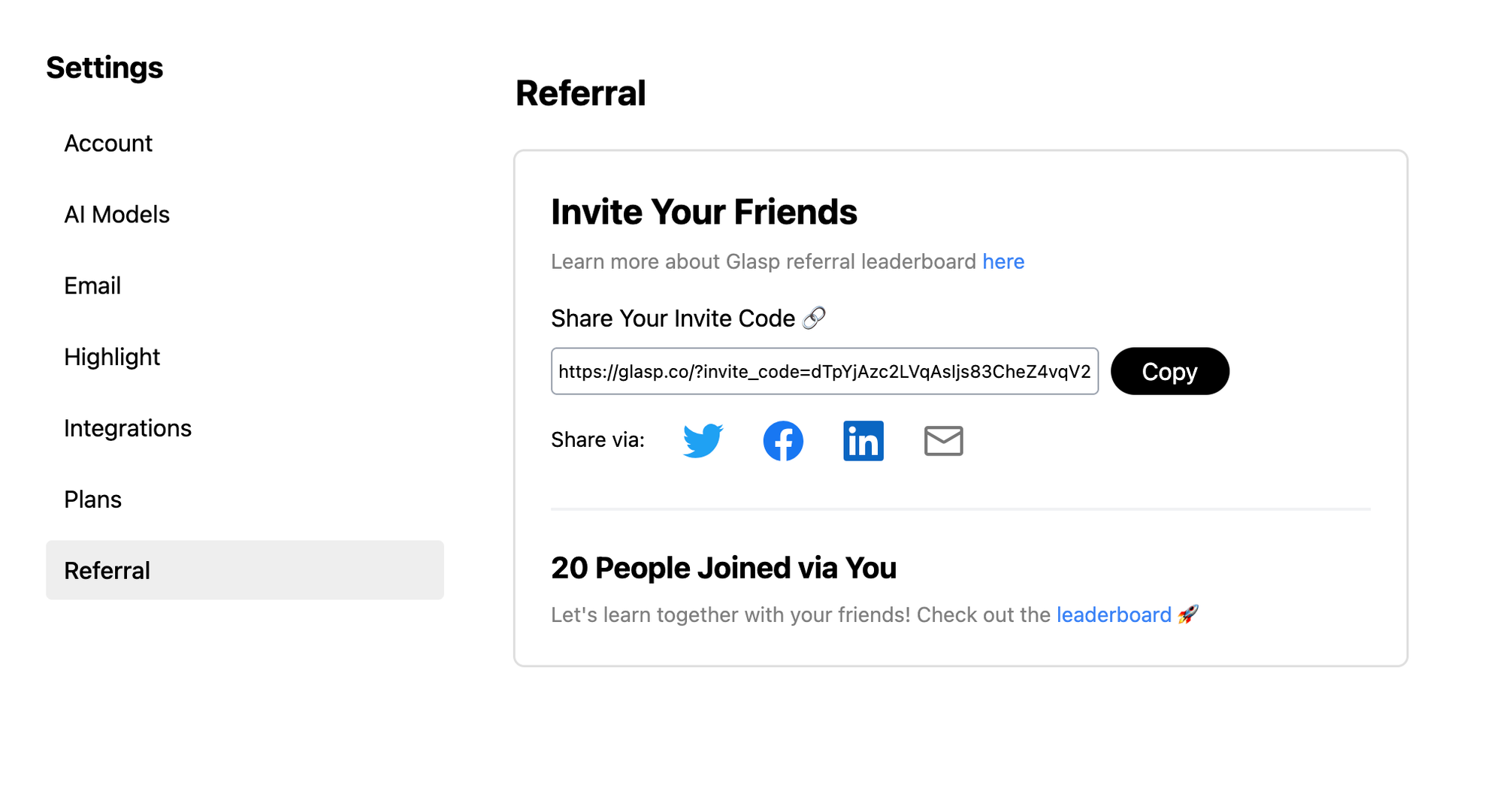 You can see the number of people you invite to Glasp at Referral on the Settings page.