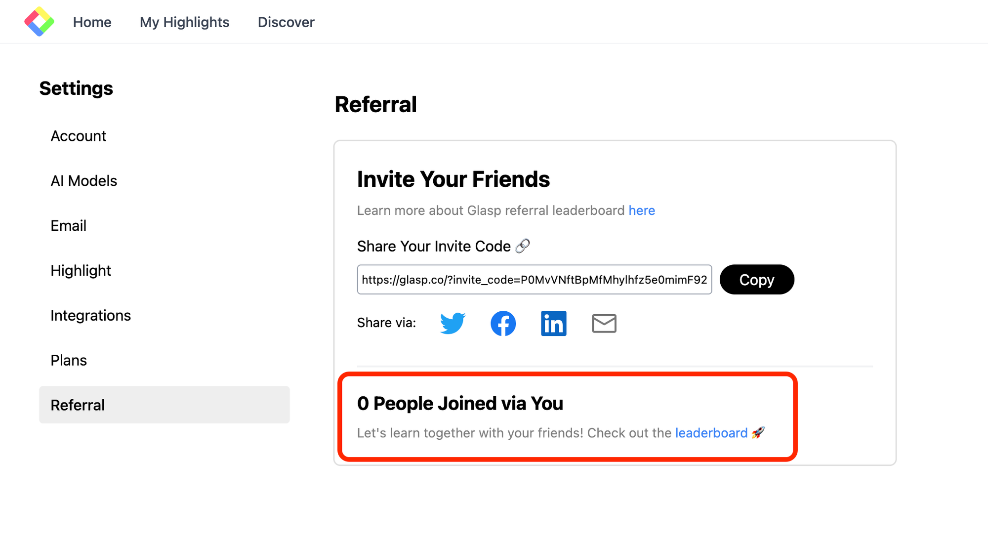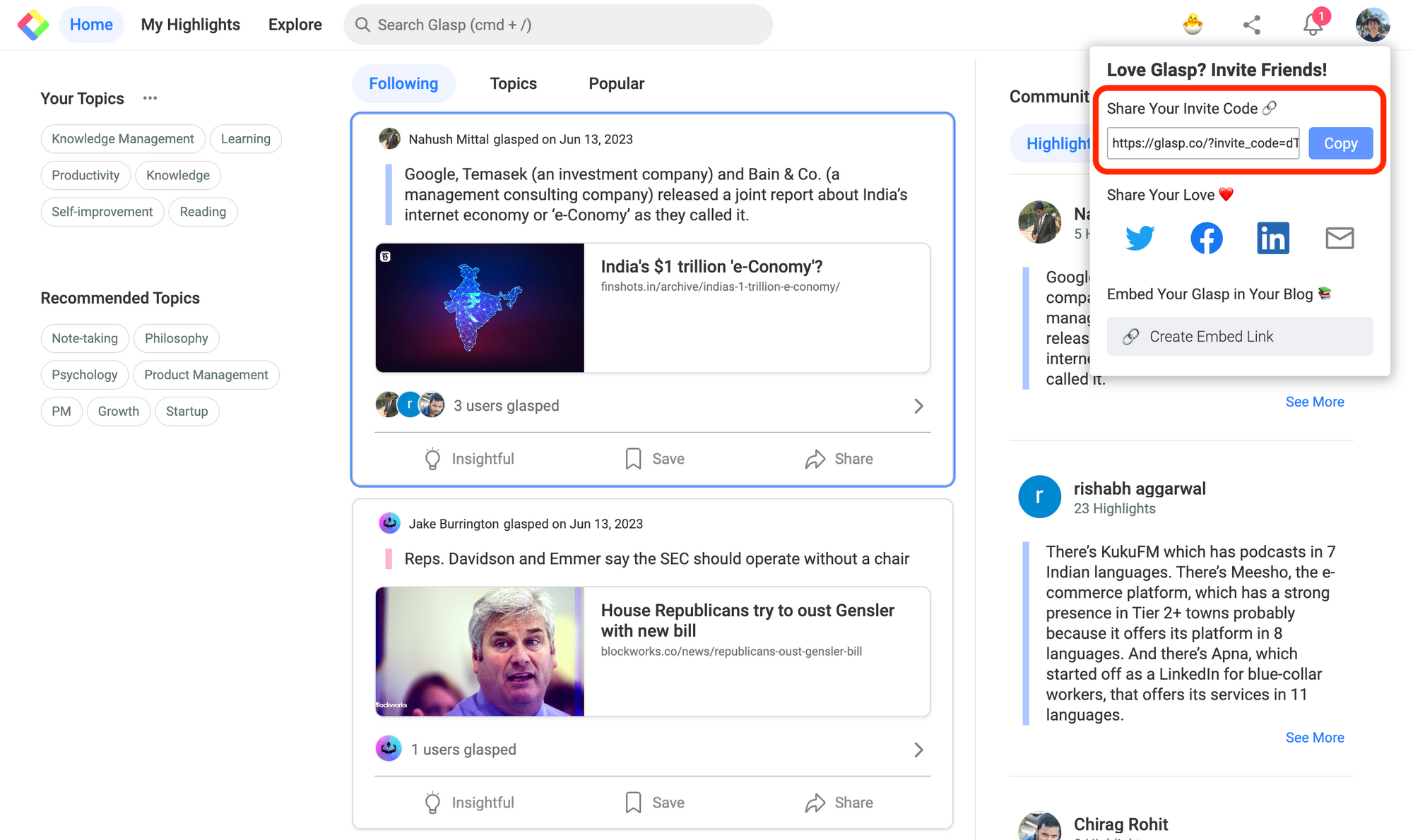 If a new user signed up for Glasp through your invitation link, we consider it invited. You can get your invitation link at the top bar on the Home feed or My Highlights. Or you can get it at the Setting as shown above.