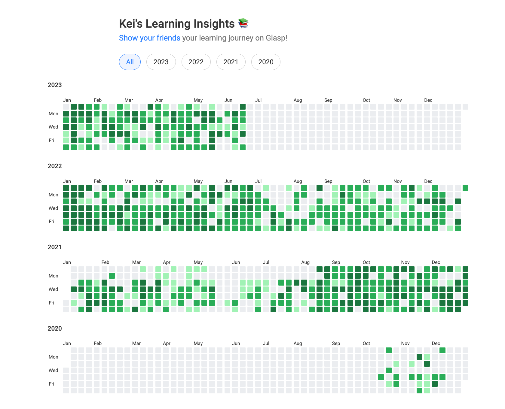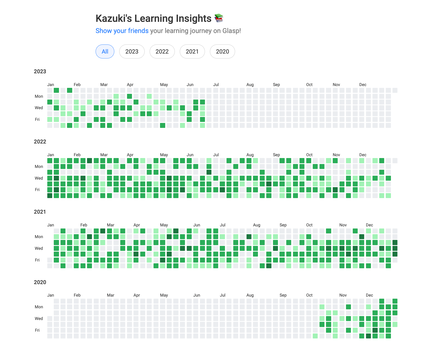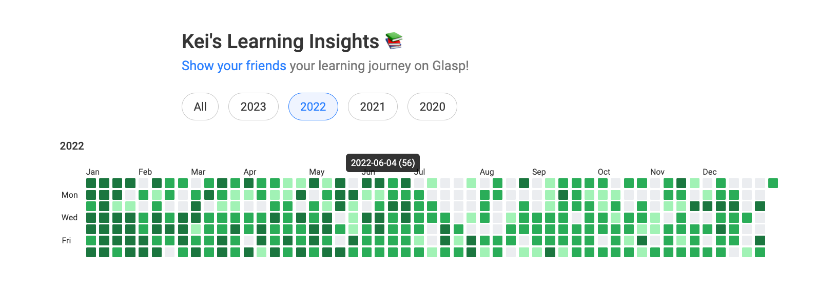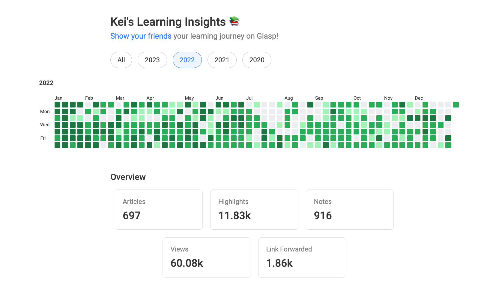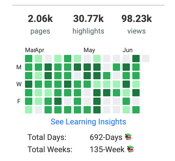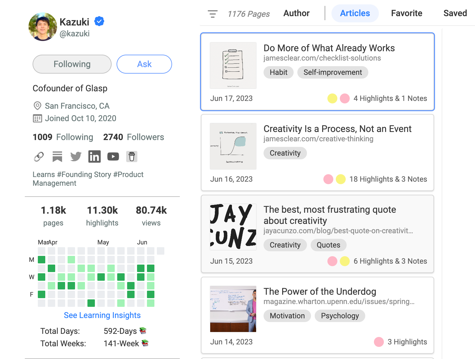 We launched a new feature called Learning Insights on Glasp. It showcases all the days you highlighted articles, YouTube videos, or PDFs. You can visually see how much you're learning and contributing to human society.